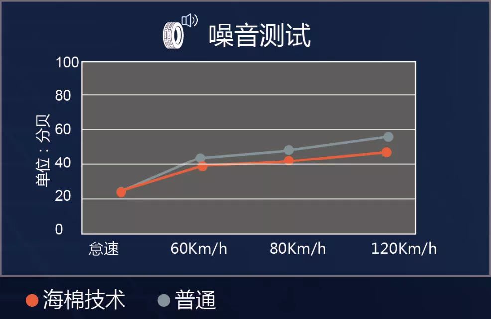 与同一产品普通轮胎相比,运用吸音海绵技术的轮胎,依照寸别不同,分别可降低噪音5-10dB,轮胎尺寸越大,降噪感觉越明显。